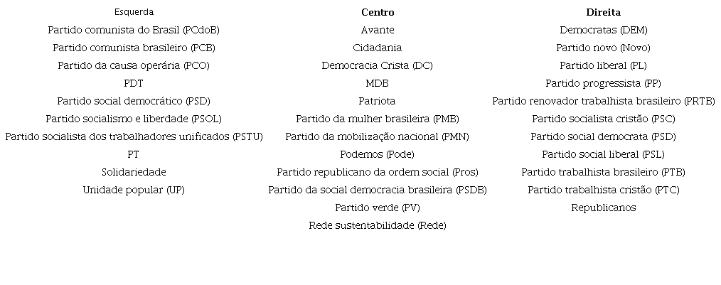 Existiam no Tribunal Superior Eleitoral (TSE) registradas, em janeiro de 2020, 33 agremiações partidárias (Brasil 2020). Usou-se como referência, para distribuir as legendas no espectro ideológico, os estudos de Carreirão (2006), Krause e Godoi (2012), e a autodenominação feita pelos próprios partidos a um questionário aplicado pelo jornal O globo, em março de 2016. Os critérios de Codato, Berlatto e Bolognesi (2018) foram também considerados. Legendas antigas foram atualizadas, partidos extintos retirados e os novos (fundados ou surgidos de fusão) foram incorporados nessa classificação, conforme exposto no Tabela 1.
