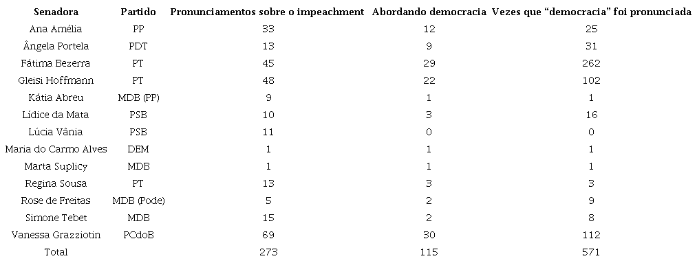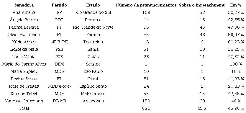 Desse universo, 273 manifestações abordaram o tema do impeachment. As três primeiras com maior número de manifestações de fala foram as senadoras da base de apoio da presidente Dilma: Vanessa Grazziotin (PCB-Amazonas), com 69 pronunciamentos; Gleisi Hoffmann (PT-Paraná), com 48; e Fátima Bezerra (PT-Rio Grande do Norte), com 45. Marta Suplicy (MDB-São Paulo) e Maria do Carmo Alves (DEM-Sergipe) usaram a palavra apenas uma vez no período para tratar do tema. Embora seja significativa a diferença numérica de intervenções orais a depender do espectro ideológico, a presente análise não se debruça sobre os motivos desse fenômeno, por afastar-se do enquadramento definido para a investigação.