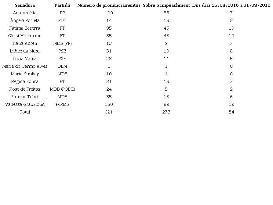 Juntas, as 13 mulheres que integravam a 55ª Legislatura proferiram 621 manifestações orais entre 2 de dezembro de 2015 e 31 de agosto de 2016. Considerou-se pronunciamento todas as intervenções previstas no rito das sessões plenárias como o uso da palavra em tribuna, a apresentação de questões de ordem, a orientação de voto, os pedidos de fala pela ordem, a inquirição de testemunhas e informantes e a declaração de voto. Tais situações estão definidas no Regimento Interno do Senado Federal e/ou são acordadas previamente pelos líderes dos partidos. Os apartes das senadoras às falas de outras senadoras, embora tenham ocorrido no período de recorte, foram contabilizados separadamente para fins de registro, mas não analisados por opção metodológica.
