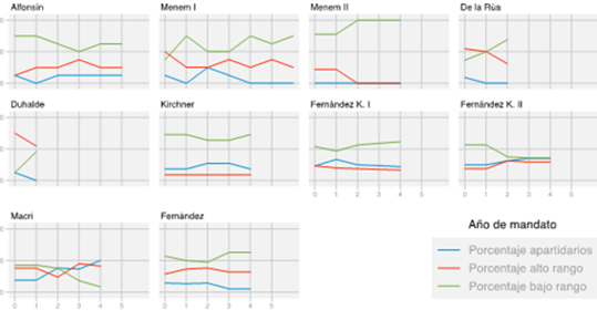 Como puede observarse, la estrategia más generalizada es la de tener un porcentaje mayor de ministras y ministros de bajo rango al inicio del mandato, pero hay excepciones, como en las presidencias de Menem I, De la Rúa y Duhalde, quienes formaron sus gabinetes inaugurales con una proporción mayor de integrantes de alto rango. Asimismo, pareciera que los miembros apartidarios son la fracción menor en la mayoría de los casos.
