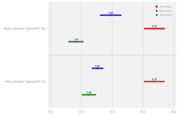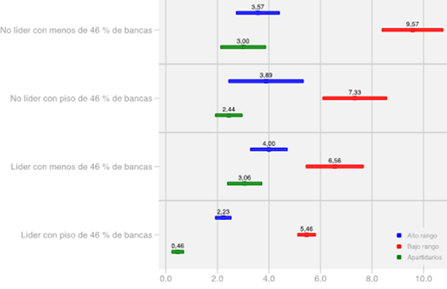 Con un control de bancas promedio, la figura 3 presenta el número probable de ministras y ministros de distinto tipo a partir del efecto de la interacción entre el liderazgo del Ejecutivo y niveles alto y bajo de cohesión del oficialismo. De esta forma, puede notarse que, cuando el oficialismo está poco cohesionado, el Ejecutivo nombra alrededor de un ministro o ministra adicional con perfil partidario de alto rango en comparación con situaciones en que su partido está fuertemente cohesionado. En el resto de los escenarios, el nivel de cohesión no parece alterar las diferencias que genera el liderazgo: presidentes líderes nombran menos ministros y ministras de bajo rango (alrededor de dos) y sin afiliación (alrededor de uno), en comparación con sus pares sin el liderazgo del partido.