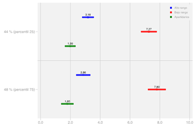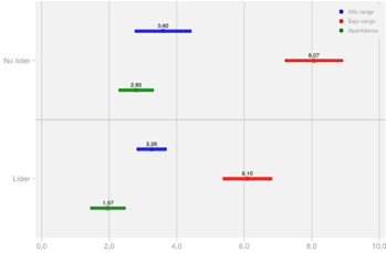 Para el presente análisis, utilizamos una medición aún más simplificada, distinguiendo los partidistas en dos grupos: alto y bajo rango. La primera categoría, alto rango, incluye todas las variantes con valor alto en la dimensión de jerarquía, mientras que la categoría bajo rango incluye todas las variantes con valor bajo en la misma dimensión. Con esta información produjimos índices de partidismo, que básicamente registran número de apartidarios, partidarios de bajo rango y partidarios de alto rango.