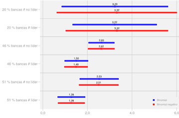 En líneas generales, podemos sostener la expectativa básica de que el incremento de poder partidario resulta en un mayor reclutamiento de ministros partidistas. Esto es así con las variables liderazgo y control de bancas. Sin embargo, contra lo que sería esperable, la cohesión partidaria tiene un efecto de signo negativo sobre la nominación partidista de alto rango. La predicción del efecto por separado de las variables nos indica que un presidente o presidenta líder de su partido nombra alrededor de uno y dos ministros apartidarios y de bajo rango menos, respectivamente, que los ejecutivos que no son líderes de su partido. Por su parte, pasar del menor (15,5 %) al mayor (51,2 %) valor de porcentaje de bancas de la muestra implica una disminución de alrededor de tres integrantes del gabinete de alto rango y de casi dos sin afiliación, y aumentan en un número cercano a cinco los de bajo rango, aunque los resultados son menos robustos a la especificación del modelo. Finalmente, pasar de la situación de menor a la de mayor cohesión partidaria de la muestra genera el nombramiento de tres integrantes menos de alto rango y la adición de tres apartidarios.6