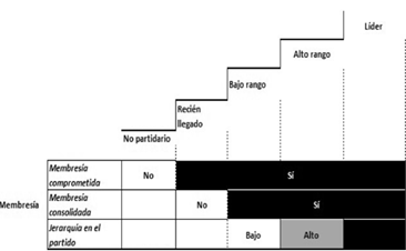 Esta definición funciona como un tipo ideal que, al momento de compararse con una observación empírica, pueda mostrar diferentes grados de cumplimiento, variación o laxitud de los atributos mencionados. Por ejemplo, el atributo ii, lealtad duradera y exclusiva a su partido, puede dar lugar a diferentes categorías de clasificación que reconozcan desde los individuos que se afiliaron recientemente al partido hasta los que muestran una relación consolidada con este. Para operacionalizar esto, Camerlo y Castaldo (2024) proponen, a partir de las posiciones extremas en el continuo de cada atributo (totalmente no comprometido frente a totalmente comprometido, etc.), considerar un elemento de gradación. Esto pone de relieve la “secuencialidad” entre los atributos definitorios, de modo que la lealtad duradera y exclusiva a su partido (atributo ii) requiere la presencia de una membresía consolidada (atributo i); y una posición jerárquica en el partido (atributo iii) requiere la presencia de una lealtad duradera y exclusiva a su partido (atributo ii) y de una membresía consolidada (atributo i). La figura 1 ilustra la sucesión ordenada de los atributos del concepto de partidismo desarrollado por Camerlo y Castaldo (2024).