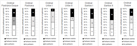 Bajo esta medición, en el agregado, los ministros estrictamente partisanos se reducen a un 30 %, comparado con el 41 % obtenido en la medición estándar. Lo mismo ocurre con los ministros no partisanos, los cuales pasan del 59 % a representar el 39 % del gabinete. Esto quiere decir que el 30 % restante pasa a ser caracterizado por una nueva categoría, los partisanos “blandos” (soft-partisan). Estos son ministros que no cumplen a cabalidad con los tres atributos de partidismo: membresía consolidada, lealtad duradera y exclusiva y jerarquía. Al desagregar los datos por periodo presidencial, encontramos que en todas las administraciones hay una reducción de los ministros estrictamente partisanos con respecto a la medición dicotómica. Sin embargo, resalta la pérdida de este tipo de ministros en las administraciones de Andrés Pastrana (1998-2002), que pasó del 49 % al 28 %; Álvaro Uribe (2002-2006), del 27 % al 9 %, y Juan Manuel Santos (2014-2018), del 55 % de ministros partidarios al 42 %. Lo mismo ocurre con los ministros no partisanos, quienes pasaron a ocupar el 36 %, el 50 % y el 25 %, respectivamente, en el gabinete de los gobernantes mencionados.