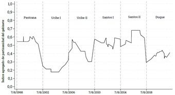 Sin embargo, cuando exploramos el empleo de los atributos propuestos en los párrafos anteriores, puede observarse una importante variación en el nivel de partidismo en los últimos seis Gobiernos colombianos. La figura 3 muestra las tres medidas agregadas de intensidad partidaria, tanto para el conjunto del periodo estudiado como discriminadas por cada periodo de gobierno.