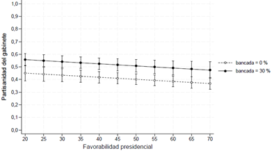 Por el contrario, no solo los resultados del modelo no brindan respaldo empírico a la hipótesis H₂, sino que el coeficiente, si bien resulta estadísticamente significativo, tiene un signo opuesto al esperado. En efecto, encontramos que, al mantener los otros factores constantes, una mayor bancada del partido del presidente en el Congreso está asociada con un grado mayor de partidismo del gabinete ministerial. El grado predicho de partidismo del gabinete para dos diferentes tamaños de bancada presidencial y el rango de niveles de favorabilidad del primer mandatario se muestran en la figura 6.