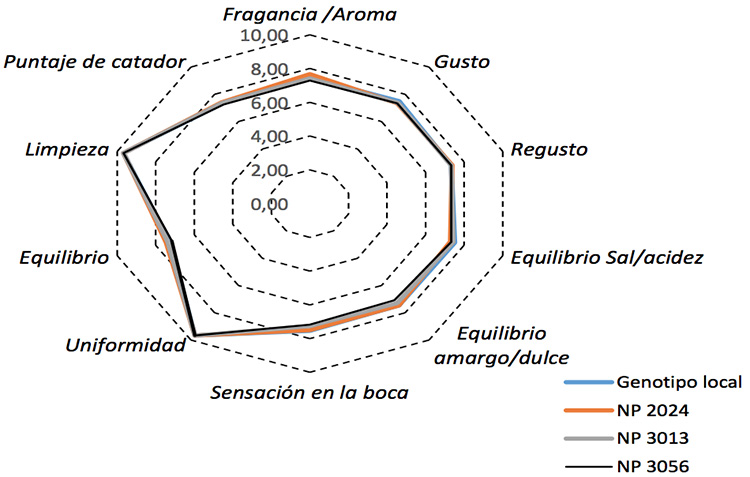 Los clones NP-2024 y NP-3056 resultaron similares en taza, diferenciados del NP-3013 y genotipo local. En un estudio realizado en las principales zonas cafetaleras del país, según indican Duicela et al. (2005), se determinó que los cafetales tradicionales y los clones del INIAP daban cualidades organolépticas similares, tanto beneficiadas por vía seca como por vía húmeda. Por otra parte, en el presente estudio, el mejor promedio en Sucumbíos correspondió a NP-2024 y en Orellana a NP-3056, por tanto, no hay consistencia en los resultados de genotipos. Esto conlleva a suponer que el proceso poscosecha tiene mayor relevancia que el genotipo sobre la calidad organoléptica.