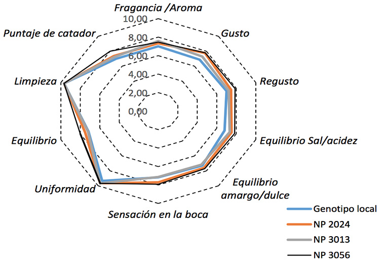Un resultado interesante, derivado del análisis gráfico, es que el genotipo local (plantas de semilla sin selección de ningún tipo), tiende a ser distinto de los clones; el clon NP-3013 se diferencia en taza de los clones NP 2014 y NP 3056.