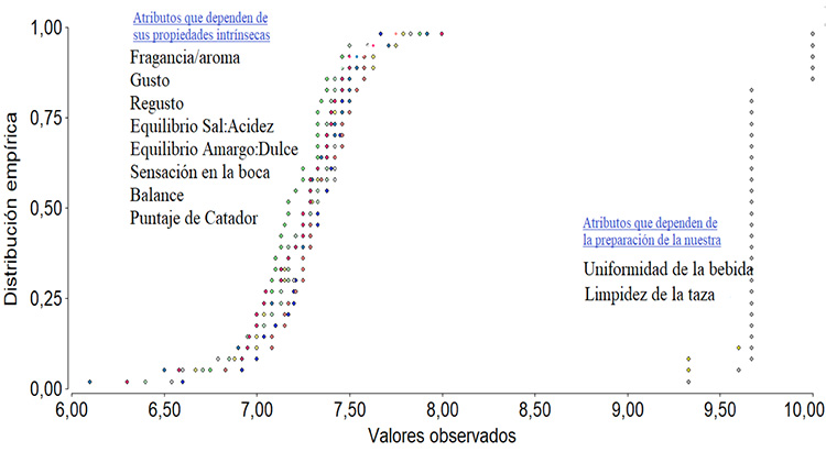 Al valorar los valores máximos, se destaca que en Limpidez de la taza y Uniformidad se valoraron con el máximo puntaje, destacando que estos atributos están directamente relacionados con la forma de preparación de las muestras; mientras que los otros atributos son intrínsecos. A fin de apreciar gráficamente el comportamiento de los 10 atributos organolépticos, se realizó la distribución empírica (Figura 1).