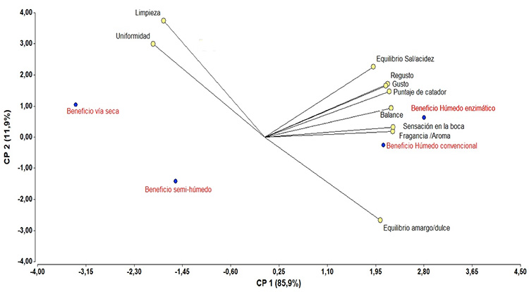 Mediante el ACP, al analizar los métodos de beneficio y las características organolépticas se determinó que la limpidez de la taza (limpieza) y la uniformidad que dependen directamente de la preparación de las muestras previo a la evaluación sensorial, tienden a ser similares; el atributo “Equilibrio amargo/dulce” resultó diferente a los demás; mientras que las otras características organolépticas tienden a mostrar un comportamiento estrechamente relacionado: En conjunto, los CP1 y CP2 explica en 97% de la varianza total (Figura 2). Los cafés lavados obtenidos mediante los métodos de beneficio húmedo convencional y húmedo enzimático originaron tazas similares, distintas de los cafés semi-lavados (método semi-húmedo) y café natural (beneficio por vía seca).