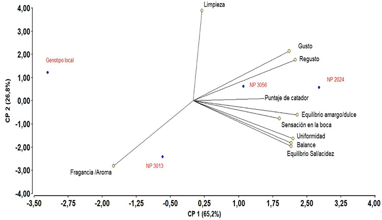 Al analizar los clones y las características organolépticas se determinó que la limpidez de la taza tiene un comportamiento distinto de todos los demás atributos (variable que depende de la preparación de la muestra). La característica organoléptica Fragancia/aroma, que es un atributo intrínseco al genotipo, también se manifiesta como un atributo no asociado. Las otras características de la bebida, excepto limpidez y Fragancia/Aroma, tienden a aproximarse y mostrar semejanzas en la taza. Los CP1 y CP2 explican en 92% de la varianza total (Figura 3).
