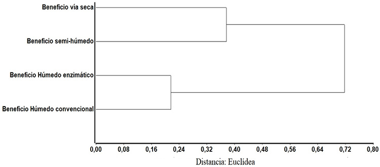 Los resultados del análisis de conglomerados jerárquicos, donde se valora el efecto del factor: clones de café robusta sobre los atributos sensoriales, permitió determinar que los métodos de beneficio por vía seca (café natural) y beneficio semi-húmedo (café semilavado), originan tazas muy similares, diferentes de los cafés lavados obtenidos con los métodos de beneficio húmedo convencional y húmedo enzimático, que son estrechamente semejantes (Figura 4).