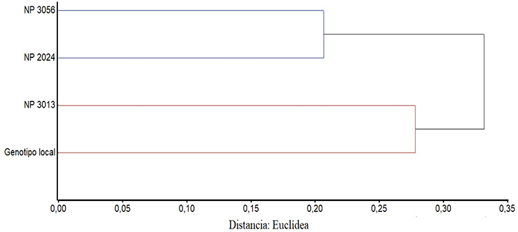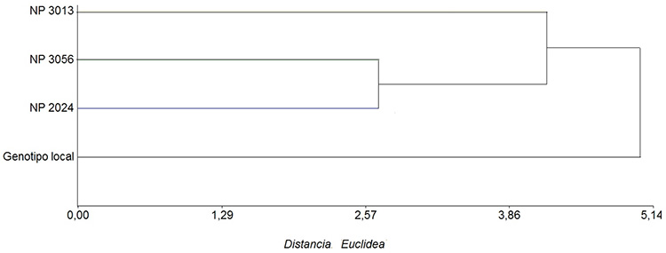 El Análisis de Conglomerados Jerárquicos (ACJ) de los genotipos, en Sucumbíos y Orellana, permitió determinar que los clones NP-3056 y NP-2024 resultaron similares en calidad de taza, muy diferenciados del NP-3013 y del Genotipo local (Figura 6).