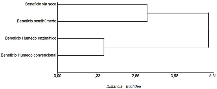 El Análisis de Conglomerados Jerárquicos de los métodos de beneficio, permitió establecer que los cafés robustas lavados, preparados con los métodos: húmedo enzimático y húmedo convencional, resultaron similares en calidad de taza (Figura 7). En la misma Figura, se observa que el café semilavado y el café natural también fueron similares en calidad organoléptica.