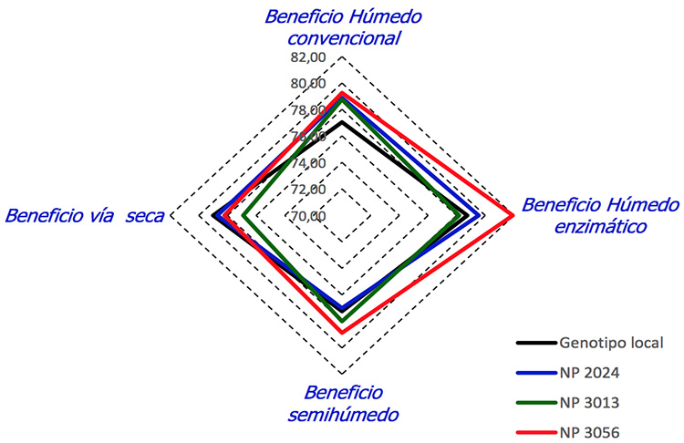 Al construir el perfil de taza de los genotipos de café en función de los métodos de beneficio, sobresale el Clon NP-3056 beneficiado con el método húmedo enzimático (Figura 8).
