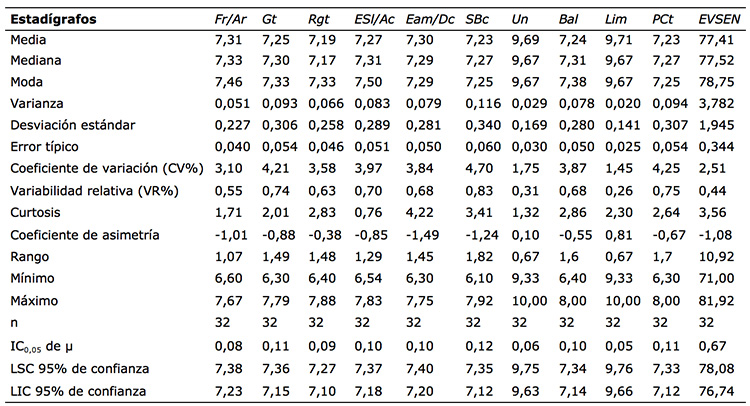 Los datos de las 10 características organolépticas, evaluadas con la normativa de la SCAA, así como para la calificación total (EVSEN) presentan los estadígrafos media, moda y mediana con tendencia a coincidir, por tanto, la distribución de las variables tiende a la normalidad. Los coeficientes de variación, en todos los casos, resultaron bajos (<5,0%). La característica “sensación en la boca” (SBc) presentó la mayor variabilidad relativa (VR=0,83%) y la limpidez en la taza, la menor variabilidad (VR=0,26%).