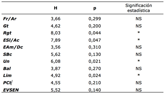 Considerando que las variables organolépticas, en todos los casos, se valoraron usando una escala ordinal de 0 a 10, se consideró pertinente realizar el análisis de varianza no paramétrico de Kruskall &Wallis, considerando como factor en estudio: “métodos de beneficio”.