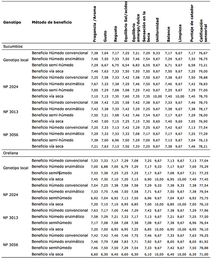 El clon NP-3056 beneficiado por la vía húmeda enzimática obtuvo una calificación sensorial de 81,92 puntos, según la norma SCAA. La calificación sensorial esta correlacionada significativamente (p<0,01) con los atributos fragancia/aroma, gusto, regusto, equilibrio sal/acidez, equilibrio amargo/dulce, sensación en la boca, equilibrio y puntaje de catador. Las cualidades de taza en función de los métodos de beneficio mostraron el mismo comportamiento en Sucumbíos y Orellana. El beneficio húmedo convencional y el húmedo enzimático dan similares calidades de taza. El café semilavado y el café natural (bien preparado) tienden a dar cualidades de taza similares.