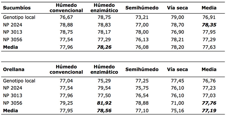 Las calificaciones sensoriales de los genotipos y métodos de beneficio, para Sucumbíos y Orellana, se expone en la Tabla 2, donde, en Sucumbíos se destaca el Clon NP-2024 y en Orellana el clon NP-3056. Los cafés beneficiados con el método húmedo enzimático tienen a mostrar consistentemente mejores promedios de calidad de taza en Orellana y Sucumbíos.