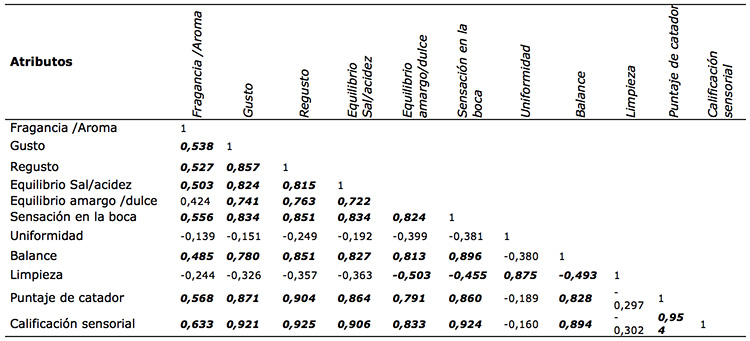 La calificación sensorial de una muestra de café robusta esta correlacionada significativamente (p<0,01) con la fragancia/aroma, gusto, regusto, equilibrio sal/acidez, equilibrio amargo/dulce, sensación en la boca, balance y puntaje de catador (Tabla 3).