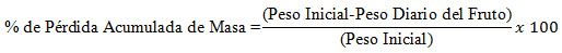 Se registró el peso de los racimos contenidos en el clamshell, por triplicado, en una balanza digital OHAUS (2100 g ± 0.01 g, USA) cada 3 días y se reportó como pérdida acumulada de masa (%) (Díaz Pérez y Araiza, 1997), utilizando la siguiente fórmula: