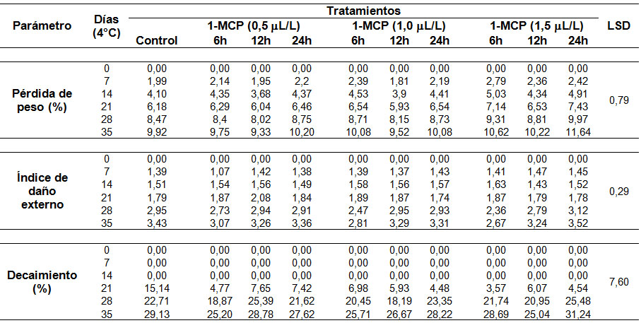 Se evaluó el efecto de tres concentraciones de 0,5; 1,0 y 1,5 mL/L de 1-MCP en frutos de uvilla expuestos durante 6, 12 y 24 h con el fin de seleccionar una dosis efectiva. La Tabla 1 muestra el efecto del tratamiento poscosecha en el porcentaje de pérdida de peso, índice de deterioro externo y el porcentaje de decaimiento de la fruta a lo largo de 35 días de almacenamiento.