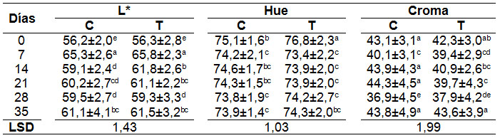 Color superficial.- La Tabla 2 muestra los cambios producidos en los parámetros de color L*, Hue y Croma de los frutos control y tratados a lo largo de los 35 días de almacenamiento. Los valores de iniciales de L, Hue y Cr* corresponden a frutos cosechados con un grado de madurez 5 (correspondiente a su madurez comercial). En el día 0 se observó un valor de L=56 que se incrementó significativamente (L=61) hasta el final de almacenamiento (día 35). No obstante, las diferencias entre los valores de L* de los frutos control y tratados no fueron significativas. El incremento de L* indica que el color naranja de la uvilla se vuelve más brillante durante el almacenamiento. Por el contrario, el ángulo Hue presentó una ligera disminución tanto en frutos tratados como controles (se observó una variación de 2 unidades entre los días 0 y 35) y tampoco se encontró diferencia significativa entre las muestras. En tanto que los valores de Cr* se mantuvieron estadísticamente similares (Cr* ≈ 42-43) durante el periodo de ensayo. Es decir que la tonalidad (Hue) y viveza (Cr*) del color naranja no se vieron afectados por el tratamiento ni por el tiempo de almacenamiento.