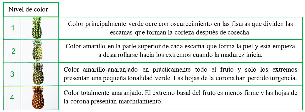 Los cambios en el color externo de la piña (Grado de Madurez) fueron registrados por triplicado por comparación visual utilizando la escala de la figura 1. Mientras que en el mesocarpio del fruto el color se registró con un colorímetro Minolta (CR-300, USA). Se midió el color en una porción de la pulpa de la parte ecuatorial de la piña, sin considerar el centro de la rodaja. Se utilizaron seis réplicas para los valores L*, a* y b* para calcular la variación o diferencia del color como ΔE* = √((L*1-L*2)2 + (a*1-a*2)2+(b*1-b*2)2).