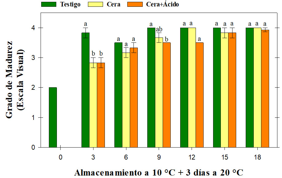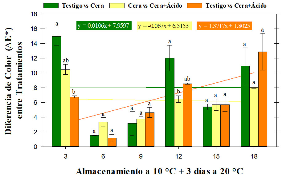 Es probable que la tendencia mencionada hubiera adquirido mayor relevancia (p≤0.05) si las evaluaciones se hubieran realizado al momento de salir del almacenamiento a 10 °C. Así, la respuesta observada en el fruto, por ejemplo al día 9, es de uno almacenado durante 12 días. Se destaca que, para ese día, Cera+Ácido presentó menor nivel de color que Testigo, como lo muestra la figura 3.