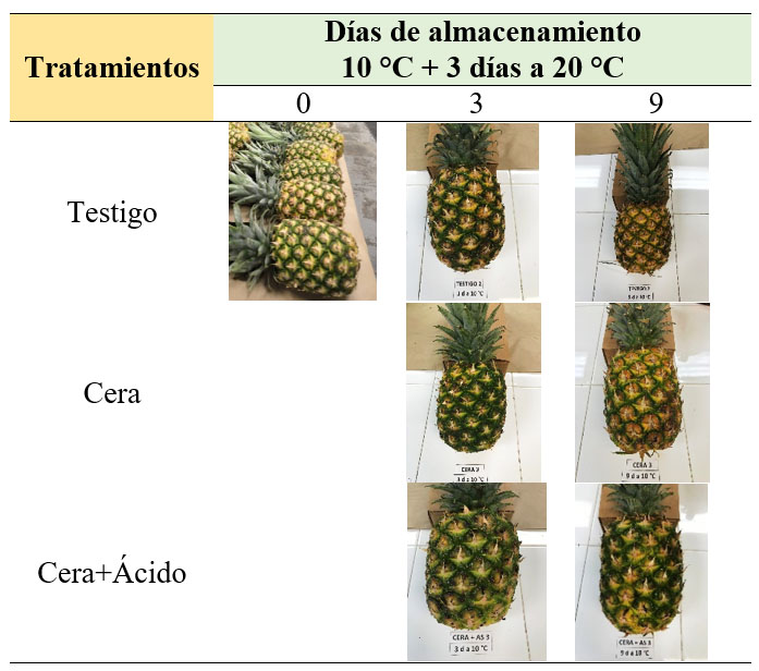 Se elaboraron dos formulaciones para el recubrimiento de las piñas. La primera (Cera) a base de ácidos grasos (5 %), aceite mineral (1 %), carbohidratos (2.5 %), polipropilenglicol (0.4 %), emulsificante (0.03 %) carboximetil celulosa (0.001 %) y sorbato de potasio (0.05 %) como antimicrobiano. Se usaron ingredientes grado alimenticio, listados en el capítulo 21 CFR (Code of Federal Regulations) de FDA (Federal Drug Administration, USA). La segunda formulación se elaboró con los ingredientes anteriores y 500 ppm de ácido 2-hidroxibenzoico (Cera+Ácido). Se formó un tercer grupo de frutos que no recibió tratamiento con cera (Testigo). La aplicación se realizó sumergiendo los frutos durante 5 s en un recipiente sin tocar la corona o penacho. Para el caso de los frutos Testigo se sumergió en agua destilada. Posteriormente, se les retiró el exceso de las soluciones y se dejaron secar a temperatura ambiente en posición horizontal, girándolos ocasionalmente. Todas las piñas se almacenaron a 10 °C durante 18 días a 85 % HR. Se analizó la muestra por triplicado antes de pasar a 10 °C. Cada 3 días se retiró muestra de cada tratamiento a 10 °C y se almacenó por 3 días a 20 °C. Pasado el tiempo a 20 °C los frutos fueron examinados.
