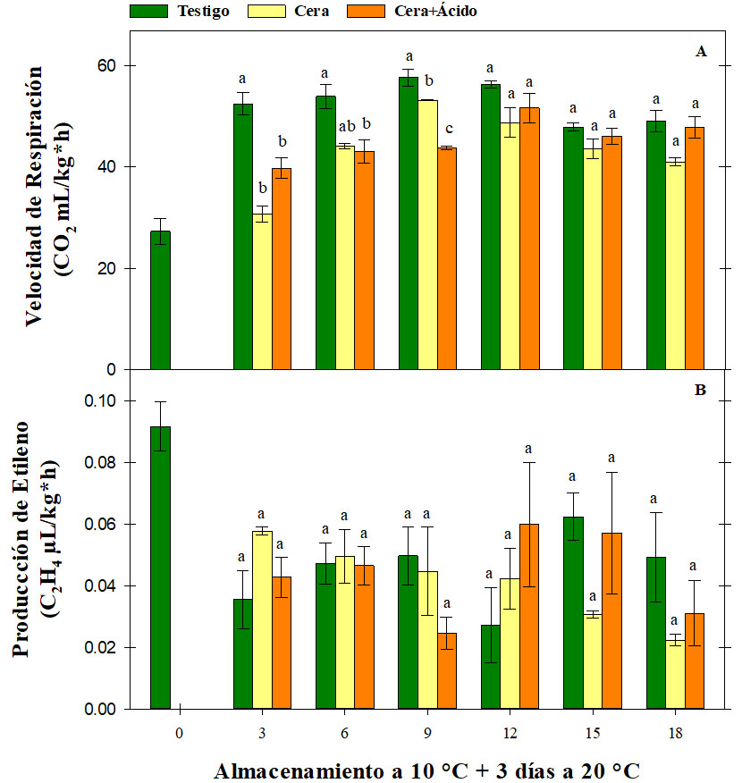 Los valores de dióxido de carbono como tasa respiratoria (CO2 mL/kg.h) y el etileno producido (C2H4 µL/kg.h) se evaluaron mediante el sistema cerrado descrito por Watada y Massie (1981) con algunas modificaciones. El fruto se incubó durante 30 min en un recipiente plástico de 10 L. Posteriormente, se obtuvo 1 mL de gas del espacio de cabeza y se inyectó en un cromatógrafo de gases Varian (Star 3400, USA) con detector de ionización de flama (FID) y conductividad térmica (TCD). La separación se realizó en una columna metálica empacada con Hayesep N 80/100 (Supelco, USA). La medición se realizó por triplicado.