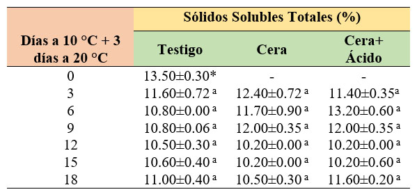 Los frutos de piña destinados para el mercado fresco de exportación, antes de ser cosechados, deben haber alcanzado su plena madurez fisiológica y tener al menos 12 °Brix (sólidos solubles totales) o más (Uriza-Ávila et al., 2018; PRODOCA, 2019). En nuestro experimento, a pesar de no haber encontrado diferencias significativas entre tratamientos para cada día de almacenamiento (Tabla 2), sí se observó que los tratamientos con Cera y Cera+Ácido mantuvieron el mínimo aceptable hasta el día 9. Posterior a ese día, la tendencia fue a la disminución de los grados Brix bajo las condiciones ensayadas.