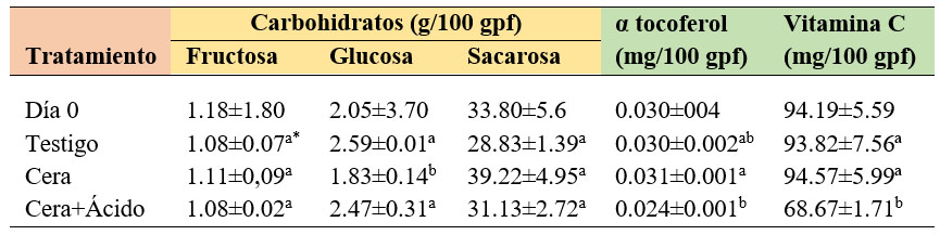 El contenido de los azúcares fructosa, sacarosa y glucosa del inicio del experimento (20 °C), no se vio afectado (p≥0.05) por los tratamientos aplicados después de 9 días a 10 °C + 3 días a 20 °C (Tabla 3). La excepción fue en la glucosa de los frutos con Cera, con 28.5 % menos (p≤0.05) que Testigo y Cera+Ácido. Esto no se pudo relacionar con el comportamiento fisiológico arriba señalado ya que los frutos Testigo presentaron mayor actividad. De Ancos et al. (2016), reportaron valores semejantes de azúcares en la variedad MD2, al menos en glucosa (1.70 g/100 gpf) y fructosa (2.15 g/100 gpf), mientras que en sacarosa fue mucho menor (6.47 g/100 gpf). En otro estudio (Hounhouigan et al., 2014) con MD2 se reportaron valores similares (glucosa 2.36, fructosa 2.28 y sacarosa 5.7 g/100 gpf) a los obtenidos por De Ancos et al. (2015) y Lu et al. (2014), pero este último en la variedad Cayena Lisa (glucosa 2.45, fructosa 2.10 y sacarosa 6.48 g/100 gpf). Es probable que los valores obtenidos de sacarosa, más de seis veces de lo reportado en literatura, se deban al estado de madurez de la piña utilizada para este experimento.