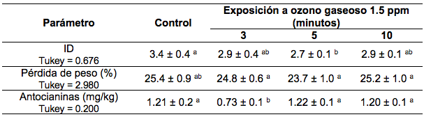 Tras la aplicación de la atmósfera de ozono sobre tres grupos de frutos (3, 5 y 10 min) y en comparación al grupo control (sin exposición al ozono), para el índice de daño (ID) pérdida de peso y contenido de antocianinas se obtuvieron luego de 18 días de almacenamiento refrigerado los valores presentados en la Tabla 1.