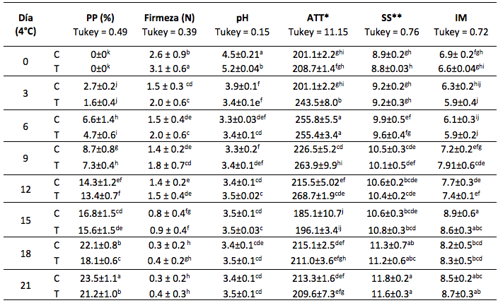En cuanto a la pérdida de peso no se encontró diferencia estadística significativa entre las muestras. Sin embargo, los frutos control perdieron mayor peso (25.4 %), y los frutos tratados expuestos por 5 min al ozono registraron la menor pérdida de peso (23.7 %). Estos altos valores de pérdida de peso se deben a la deshidratación, que es un factor importante de control, debido a que promueve la degradación de la membrana celular de tejidos influyendo en su firmeza generando arrugamiento y disminución de calidad sensorial y valor comercial, al ser el agua el componente mayoritario con un 89-84 % (Ita y Flores, 2017). Resultados similares se encontraron en arándano expuesto a 35 ppm de ozono durante 10 min (Moreno, et. al., 2015).