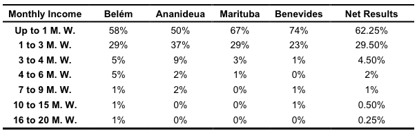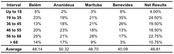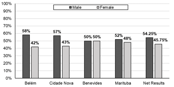 The data equivalent to the age of the interviewees in Belém, Ananindeua, and Marituba entails that the majority of them are older than 46 years, with a percentage of 59% (sum of the interviewees’ age greater than 46 years old), 61%, and 55%, respectively. Benevides, on the other hand, have shown a younger population, standing between 19 and 45 years old (61%). Benevides portrays the same observed in the Berno (2020) study, in which the interviewees were between 26 and 45, being a younger population. Furthermore, the average age from Cidade Nova was the bigger among all of them (50.32), while Benevides was the smaller (40.09).