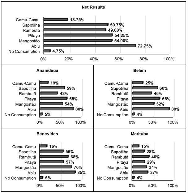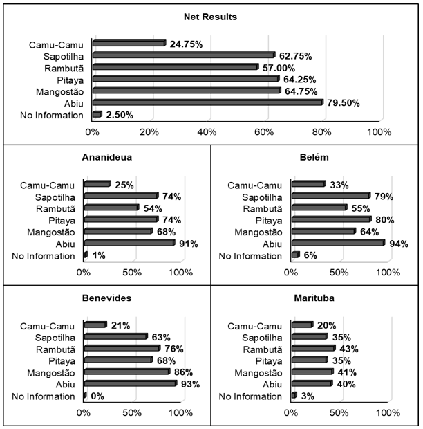 As shown in chart 01, among the interviewees only 2.5% have reported bearing no information on the respective fruits, which entails the underuse hitting this species might not be given rises by lack of information comprising that. The less known fruit was Camu-Camu both in the net results (24.75%) as well as in each town individually. On the other hand, Abiu was the most known fruit concerning net results. As regard the individual analysis, Abiu was more common only in 3 out of 4 of towns – Belém, Benevides e Ananindeua –, whereas, in the Marituba town, Rambutã was pointed out as the most known. Oliveira et al. (2020) has found that only 15% of the consumers pointed out have an interest in consuming Pitaya, whereas, in this present research findings, 79,5% out of the consumers claim to know about these fruits.