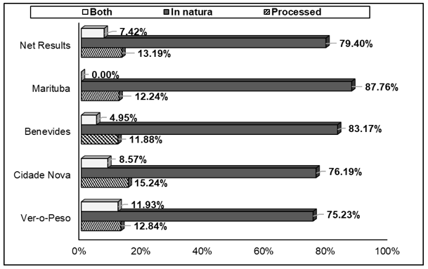 Four commercial centers (Mercado Municipal de Marituba Governador Simão Jatene, Benevides Market-Place, Complexo Feira Cidade Nova and Ver-o-Peso) spotted in Marituba (Latitude: -1.35532, Longitude: -48.3432), Benevides (Latitude: -1.36133, Longitude: -48.2454), Ananindeua (Latitude:-1.35721, Longitude: -48.39934) and Belém (Latitude: -1.45502, Longitude: -48.5024) municipalities from Pará state, respectively, were assessed using 400 questionnaires altogether, each commercial center comprising 100 of them. It was performed a structured interview with multiple-choices and closed-ended questions concerning both socio-economical as well as costumers’ preferences information comprising variables as age, education, wealth, sex, knowledge concerning those fruits and consumption. The interviews occurred during November 2020, mainly in the morning, in the following days: 12, 25, 19, and 26, respectively. The collected data was organized in Excel virtual spreadsheet, and, afterward, submitted to descriptive statistics to infer both the socioeconomic profile of the customers as much as their preference for those fruits.