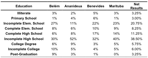 As it can be observed in Table 3, it entails the result of the education stage of interviewees is mainly complete high school, which accounted for 38.50%, while incomplete elementary education is spotted in the second position, with 20.75%. A research in the Bahia state (Oliveira, 2020) showed that 53% and 22% of respondents, respectively, had high school and elementary education, concordantly with the information found in the present research.