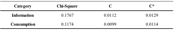 As can be seen in table 04, Pearson’s Modified Contingency Coefficient to Information as well as to consumption and the locations is utterly low (0.0129 and 0.0114, respectively), which means that the relationship between these two categorical variables is quite weak. Therefore, it may be concluded that the preferences of the costumers are not strongly related to the evaluated locations, and it stands to reason that the following analysis can be extended to all the regarded farmers’ markets individually as well as the net results drew from the whole data.