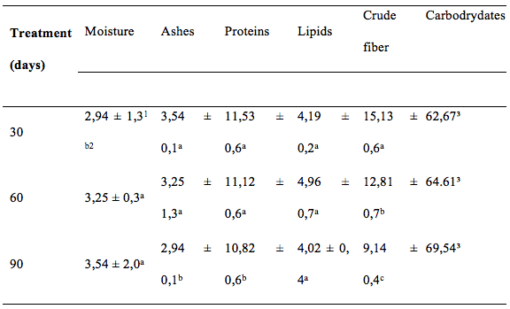 For the lipid variable, there was a significant increase in the mean storage time of 60 days compared to the other treatments. However, for the crude fiber there was a significant decrease in the means between the time of 30, 60 days and 90 days of storage. During the storage Kon (1968) mentions that several reactions occur inside the seed that can cause an increase or decrease in nutritional parameters of the grain.