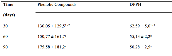 Table 6 shows the data related to the maintenance of phenolic compounds and antioxidant activity (DPPH) of coffee beans submitted to different storage times. It is possible to notice that the time promoted a significant reduction in the antioxidant activity of coffee. It is known that the increase in temperature can accelerate chemical reactions, or even in this case, it can cause loss of antioxidant activity in samples subjected to heat. The samples were stored in a storage room at 25 °C without relative humidity control. Some authors also state that the stability of antioxidant compounds also decreases with exposure to light and oxygen, which could explain the result found in the present study (CUPPET, SCHNEFF & HALL, 1997).