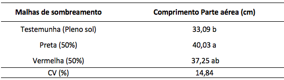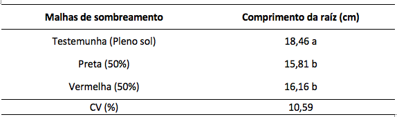 Cenouras com maior comprimento da parte aérea foram obtidas com malha preta (50%). No entanto, não houve diferença estatística entre malha preta e a malha vermelha (50%). Contudo, todos resultados foram superiores ao cultivo a pleno sol (testemunha) (Tabela 02). Os valores obtidos em todos os tratamentos para comprimento da parte aérea estão dentro do esperado para cultivar Nantes, em que a folhagem pode atingir aproximadamente 30 cm de comprimento (EMBRAPA HORTALIÇAS, 2013).