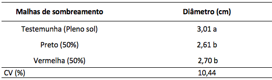 Cenouras com maior diâmetro foram obtidas no cultivo em pleno sol (testemunha), já as malhas de sombreamento não diferiram entre si (Tabela 03). A cultivar Nantes apresenta diâmetro de 3 a 4 cm, no entanto, as raízes se beneficiaram da incidência direta de radiação no cultivo em pleno sol (testemunha) expressando maior diâmetro apresentando resultados conforme a característica da cultivar.