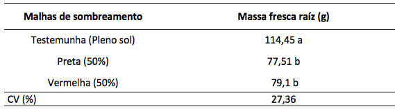 Para massa fresca da raiz os maiores valores foram obtidos no cultivo em pleno sol (testemunha), entre malhas de sombreamento não houve diferença estatística (Tabela 04).