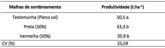 A produtividade total de raízes variou de 50,5 a 33,3 t.ha-1 com maiores rendimentos no cultivo em pleno sol (Tabela 05). Estes maiores rendimentos verificados na testemunha podem estar relacionados à adaptação da cultivar a ambiente de pleno sol.