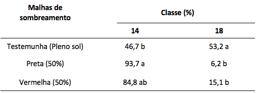 A classificação 14 obteve maior número de cenouras. No entanto, em cultivo em pleno sol os valores obtidos são similares entre as classes 14 e 18, ou seja, percentuais são próximos.