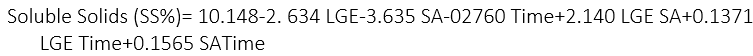 There was a significant effect (p<0.05) of the interactions between the factors LGE and SA, between LGE and time, and between SA and storage time on the concentration of soluble solids in the studied strawberries. The regression analysis generated the following equation 9: