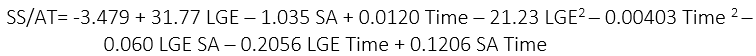 The Regression analysis for the variable SS/AT ratio indicated a significant effect (p< 0.01) between the LGE and time factors; LGE and SA and between the LGE and time factors in the SS/AT ratio of strawberries, given by the regression equation (10):
